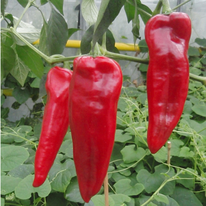 Die ca. 17-20 cm langen, spitzen, knackigen Paprika reifen von dunkelgrün nach leuchtend rot ab. Die Früchte sind knackig, festfleischig und im reifen Zustand wunderbar süß.